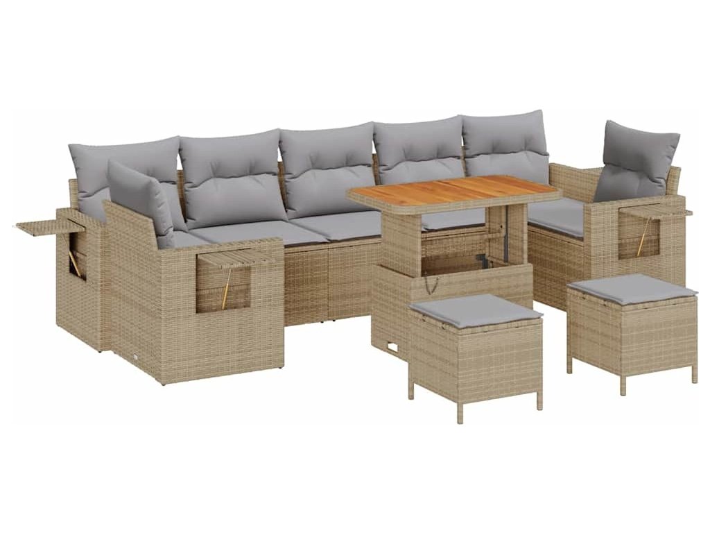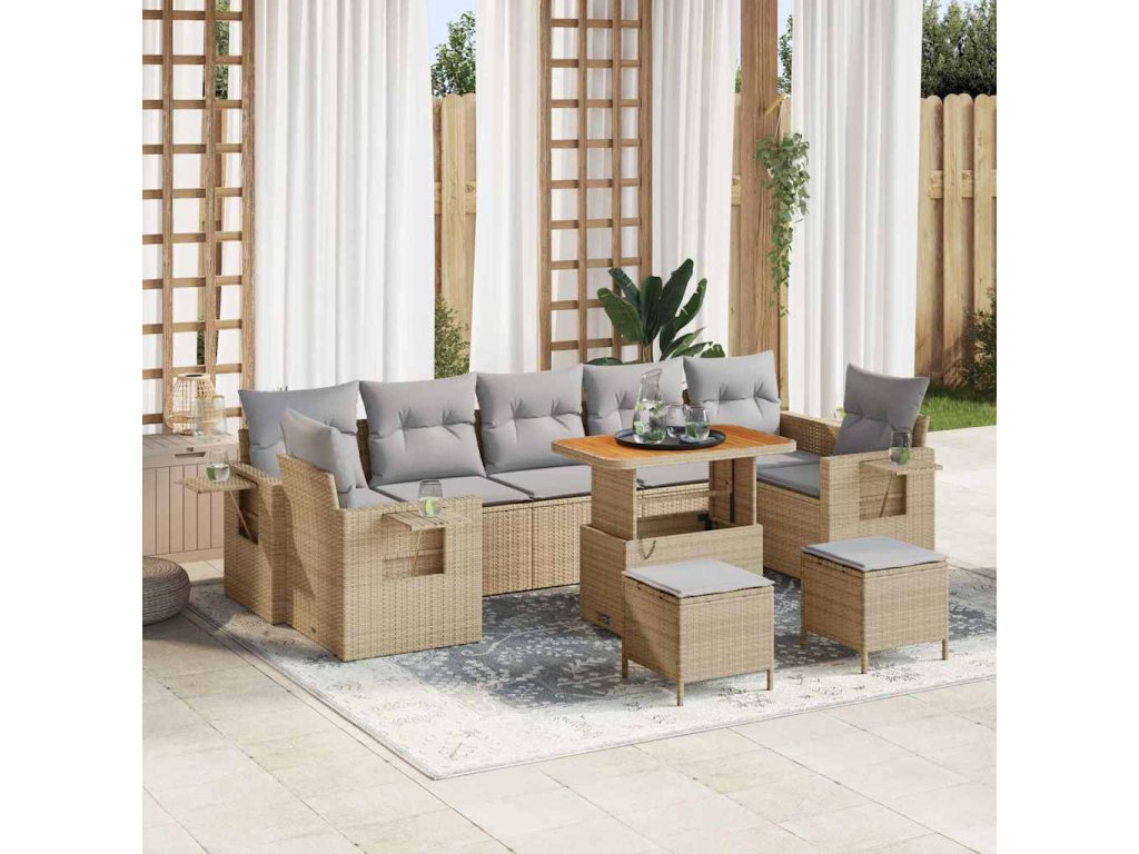 - Kvalitní materiály: Tento set má práškově lakované ocelové rámy, které zaručují stabilitu. Poly ratan a povrch z masivního akáciového dřeva dodávají eleganci i odolnost. Tyto materiály odolávají počasí a dělají z tohoto sofa setu skvělý kousek na ven.