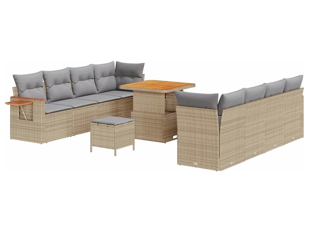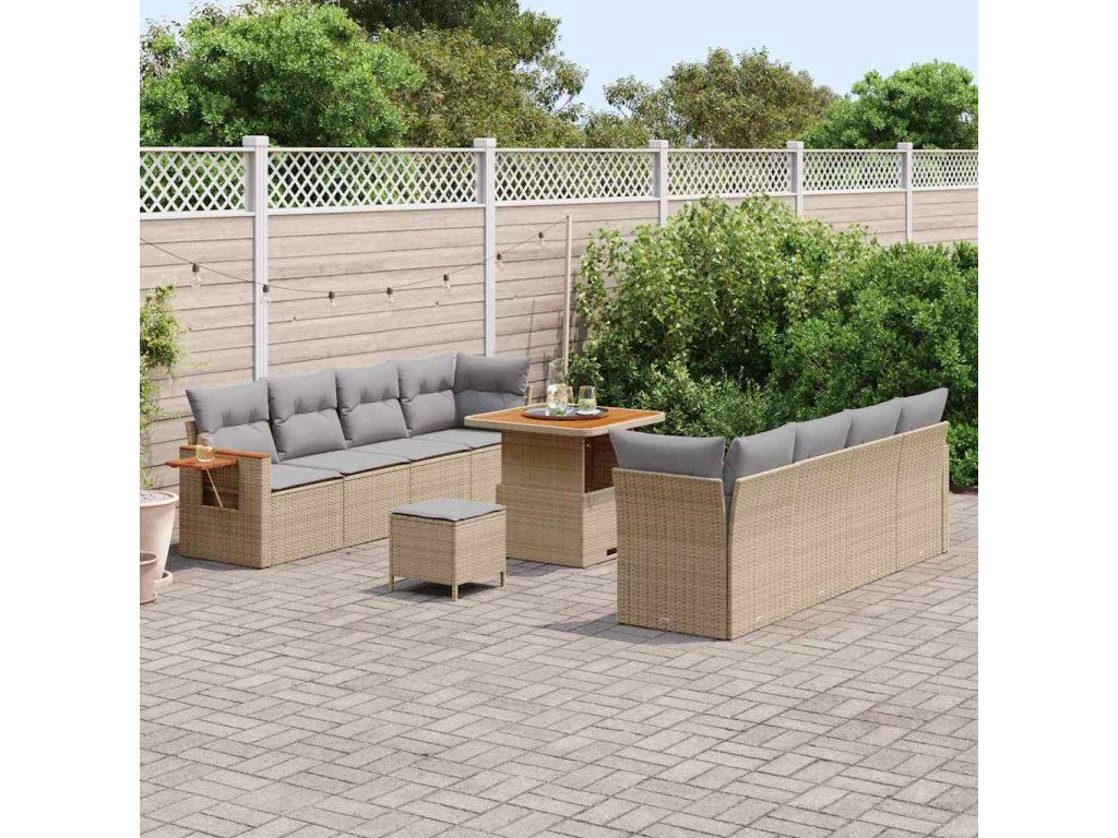 - Materiály: Tato zahradní sedačková souprava je vyrobená z poly ratanu, co je známý svou odolností a schopností zvládat různá počasí. Má silný práškově lakovaný ocelový rám, co zajišťuje, že vydrží dlouho. Povrchy z masivního akáciového dřeva dodávají přírodní a příjemný vzhled, což dělá soupravu středobodem jakéhokoli venkovní prostoru. Skvěle sladěné materiály zajišťují dlouhou životnost, takže si můžete užívat tento nábytek sezonu po sezoně.