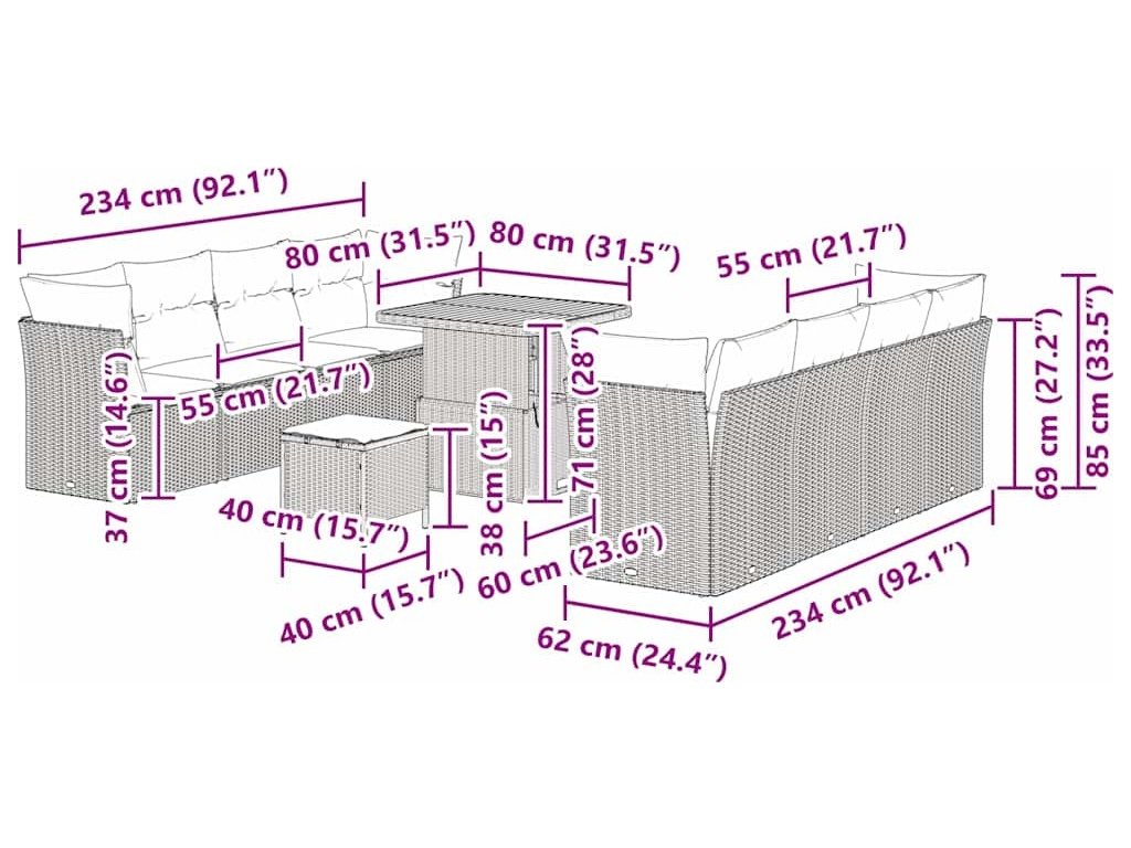 - 4 x Rohové sedadlo: 62 x 62 x 85 cm (ŠxHxV)