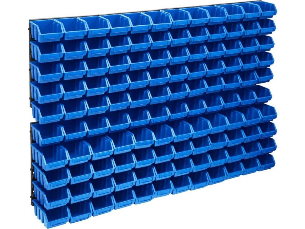 Tento funkční držák se stohovatelnými boxy nabízí celou řadu možností pro uložení malých součástek, jako jsou šrouby, hřebíky, matice, objímky, spoje apod. Do osmi pevných nástěnných panelů je zasazených 120 zásobníků, které si lze označit, abyste měli lepší přehled o jejich obsahu. Jednotlivé boxy můžete také samostatně vytahovat a naskládat je na sebe. Úložnou sadu je možné libovolně rozšiřovat a dá se snadno namontovat na stěnu garáže nebo kůlny. Soupravu skladovacích zásobníků si můžete přizpůsobit dle vlastních potřeb.