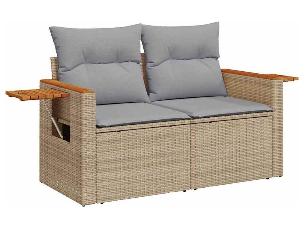 - Součásti: Set má pohodlné sezení s opěrkami z poly ratanu, takže se na něm hezky relaxuje. Každý díl má příjemné venkovní polštáře, které se snadno sundají pro praní nebo výměnu, takže stačí udržovat hygienu. Sedací plochy z hnědého akáciového dřeva tvoří ideální místo na nápoje nebo dekorace.