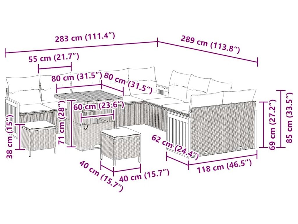 - Celkové rozměry: 289 x 283 x 85 cm (D x Š x V)