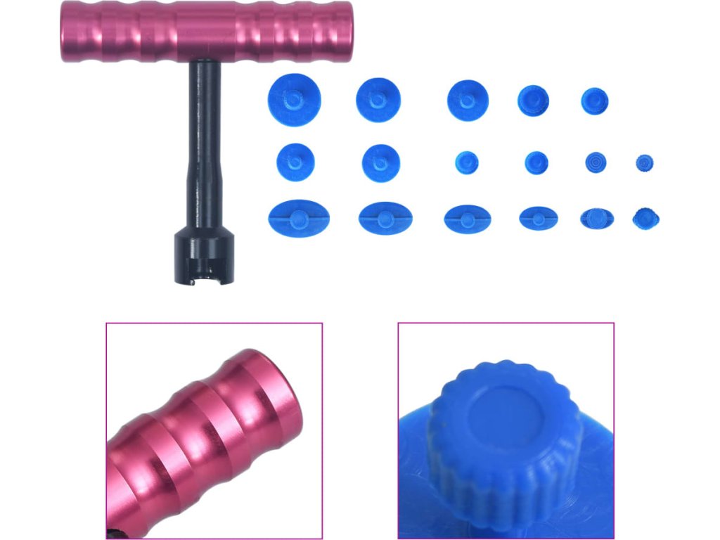 Tato 19dílná sada nářadí obsahuje 1 držák na vytahování přísavek ve tvaru T a 18 lepících přísavek. Je určená k vytahování menších promáčklin na karosérii auta, aniž byste poškodili tovární lakování svého vozu nebo ho museli přelakovávat.