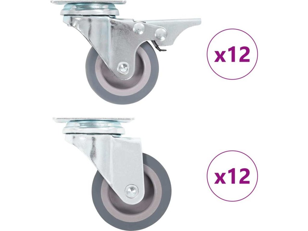 - Balení obsahuje 12 otočných koleček a 12 otočných koleček s brzdou