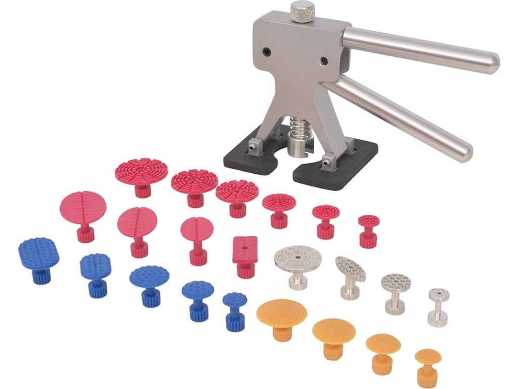 Tato 24dílná sada obsahuje 23 lepicích přísavek a vytahovací zařízení a je ideální pro opravu karoserie bez poškození laku. Vytahovák je velmi pevný a odolný. Spodní strana vytahováku je měkká a nebude poškozovat barvu vašeho auta. Má jednoduché ovládání. S touto opravnou sadou na domácích opravu drobných poškození můžete ušetřit spoustu peněz po malé nehodě.