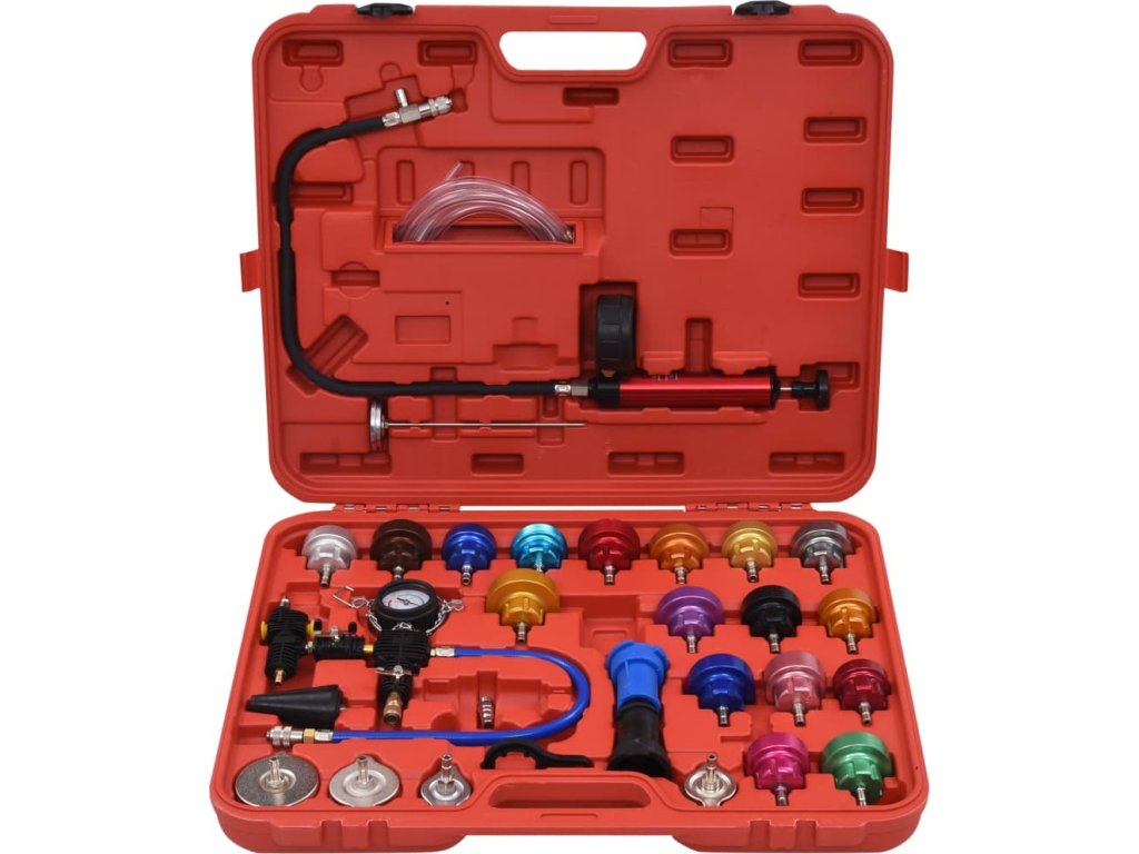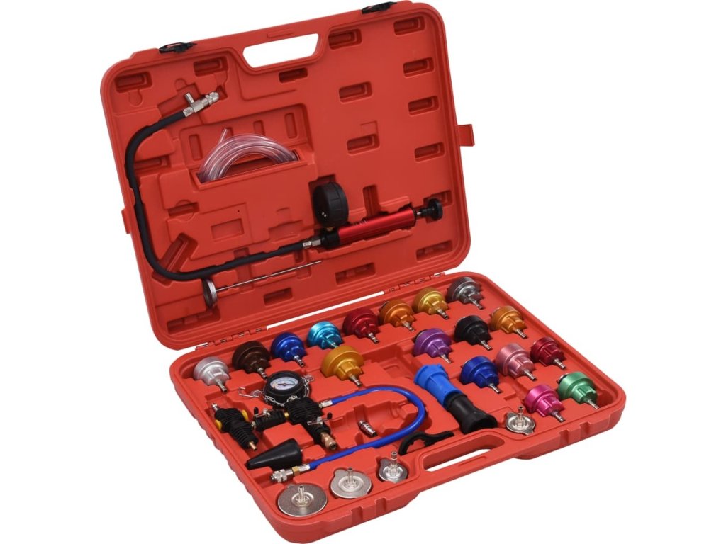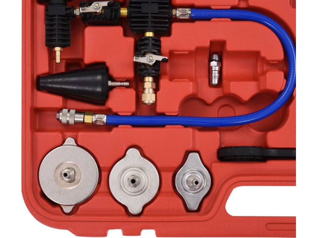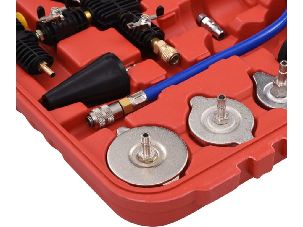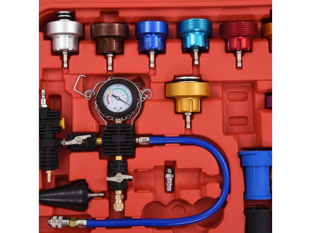 Tato sada, vyrobená z kvalitního plastu a hliníku je praktická, odolná vůči opotřebení a nepodléhá korozi. K dispozici jsou barevně označené testovací uzávěry chladiče, což usnadňuje identifikaci při výběru vhodného testovacího uzávěru. Tato sada je vhodná pro většinu domácích a zahraničních vozidel.