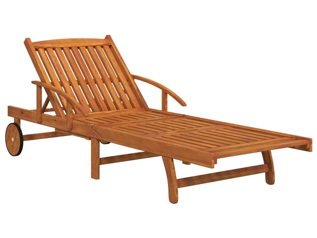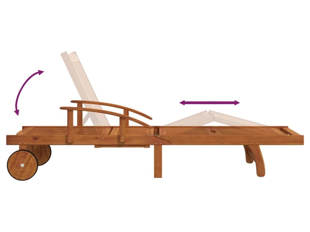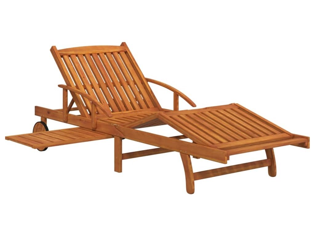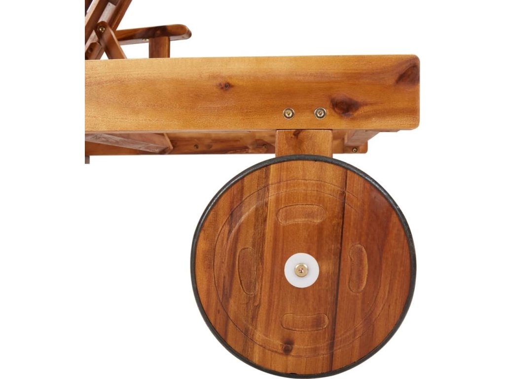 Tato zahradní sestava se vyznačuje pevnou konstrukcí z masivního akáciového dřeva s olejovou povrchovou úpravou, což jí dodává na stabilitě a odolnosti. Pevnou desku stolu lze využít k vystavení drobných předmětů na dosah ruky. Lehátko má také dvě kolečka pro snadné nastavení délky. Pokud lehátko a stolek právě nepoužíváte, můžete je složit, aby vám zbytečně nepřekážely.