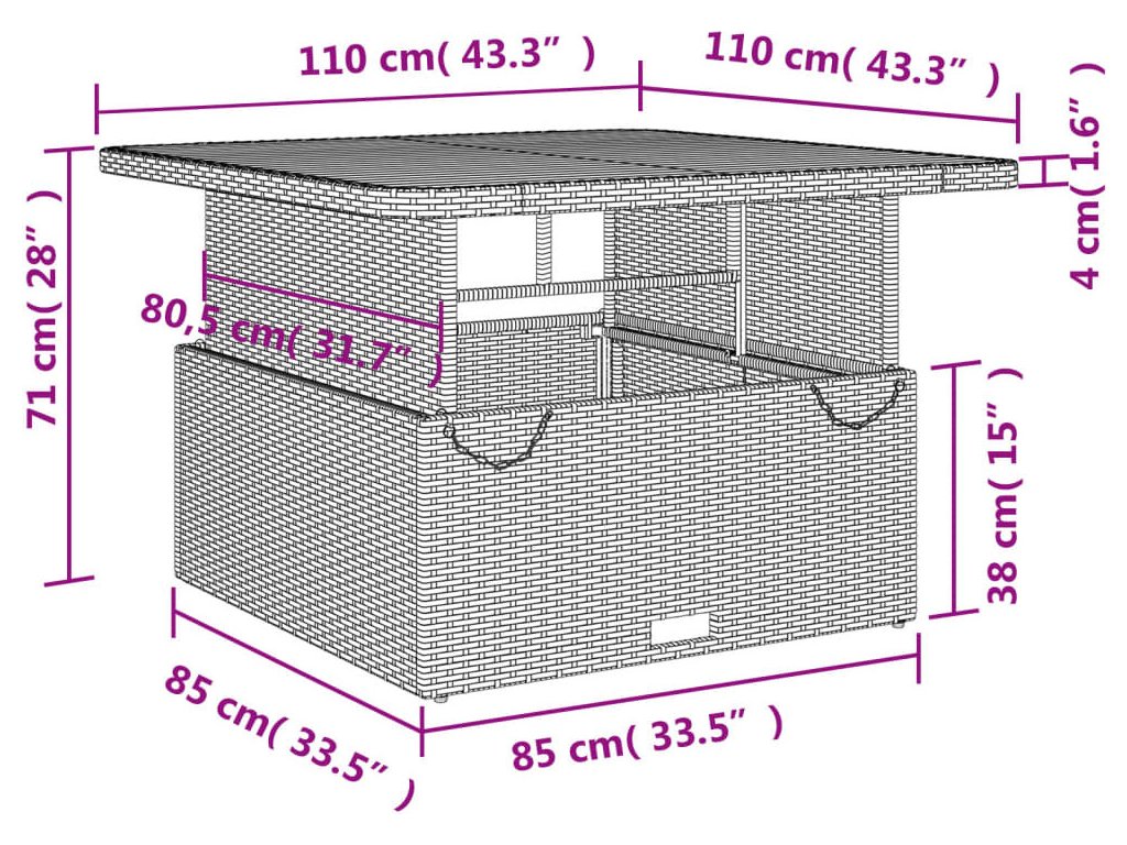 - Rozměry stolku: 110 x 110 x 40/71 cm (D x Š x V)
