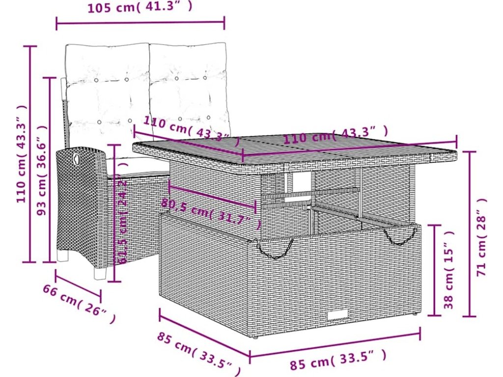 | Rozměry stolku: | 110 x 110 x 40/71 cm (D x Š x V) |