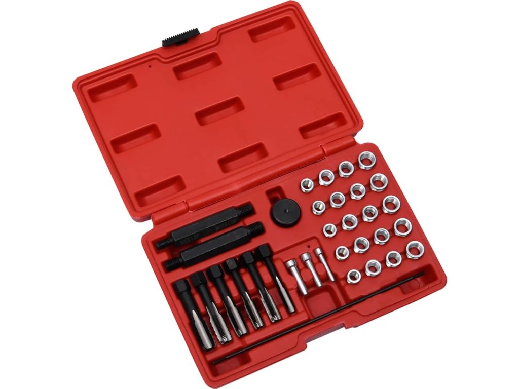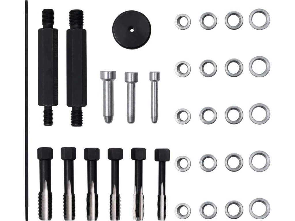 Komplexně vybavená sada je vhodná pro opravy závitů žhavicích svíček 8 mm, 10 mm (rozteč 1,0 a 1,25) a 12 mm. Tato sada zahrnuje nástroje pro přesné vkládání závitových vložek do hlavy a je vybavená jedinečným systémem závitníků pro zajištění jejich správného zarovnání. Obsahuje také čtyři velikosti závitových adaptérů pro běžné velikosti žhavicích svíček.