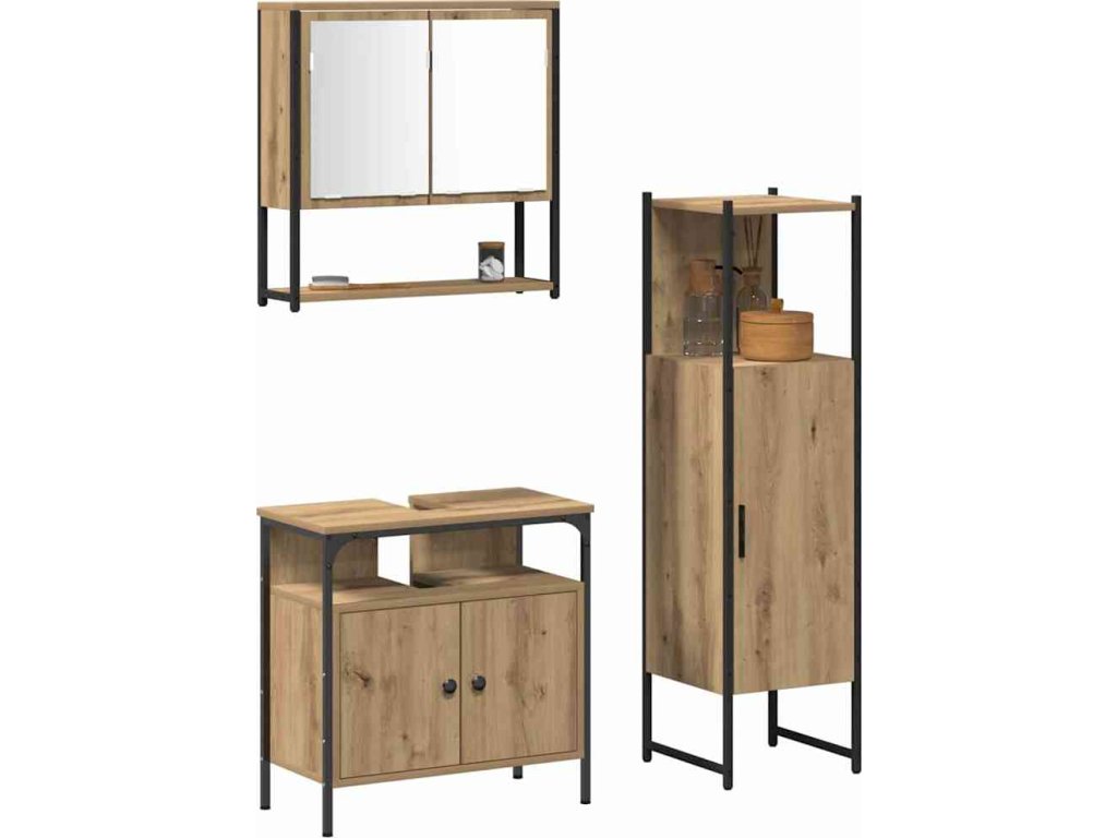 - Komplexní úložné řešení Tento set obsahuje tři důležité kusy — zrcadlovou skříňku, skříňku pod umyvadlo a vysokou koupelnovou skříň. Každý kousek má dost místa pro úhledné uložení toaletních potřeb a dalších věcí. Zrcadlová skříňka je skvělá pro každodenní úpravy a policové uspořádání v koupelnové skříni šetří prostor.