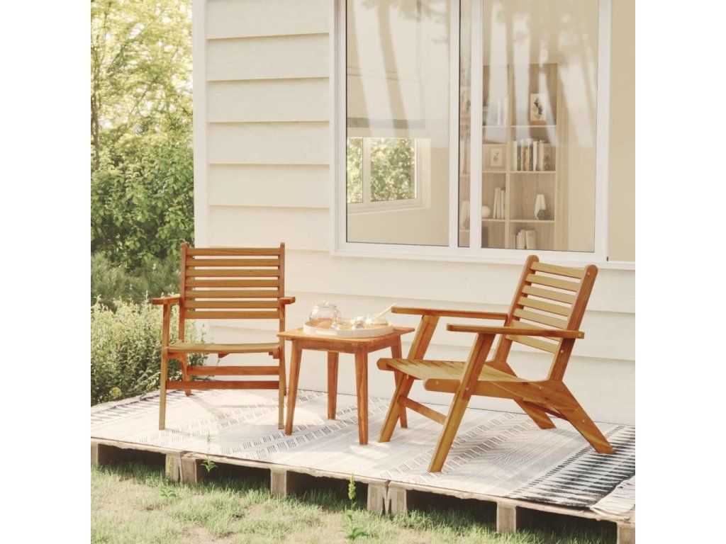 Venkovní bistro set je zhotovený z masivního akáciového dřeva, je tedy robustní a stabilní. Povrchová olejová úprava usnadňuje jeho čištění. Relaxační židle mají klasický lamelový design pro pohodlné sezení. Pořiďte si tento dřevěný bistro set a dodejte své zahradě či terase nádech zábavy a pohodlí!