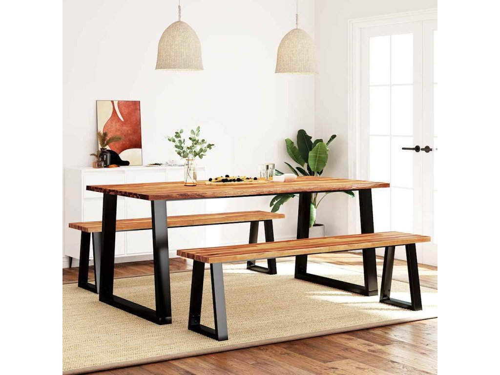 - Masivní akáciové dřevo: Sedák lavice a deska jídelního stolu jsou vyrobeny z masivního akáciového dřeva. Masivní akáciové dřevo je nádherný přírodní materiál. Akáciové dřevo je tropické tvrdé dřevo, které má hustou strukturu a je pevné a odolné.