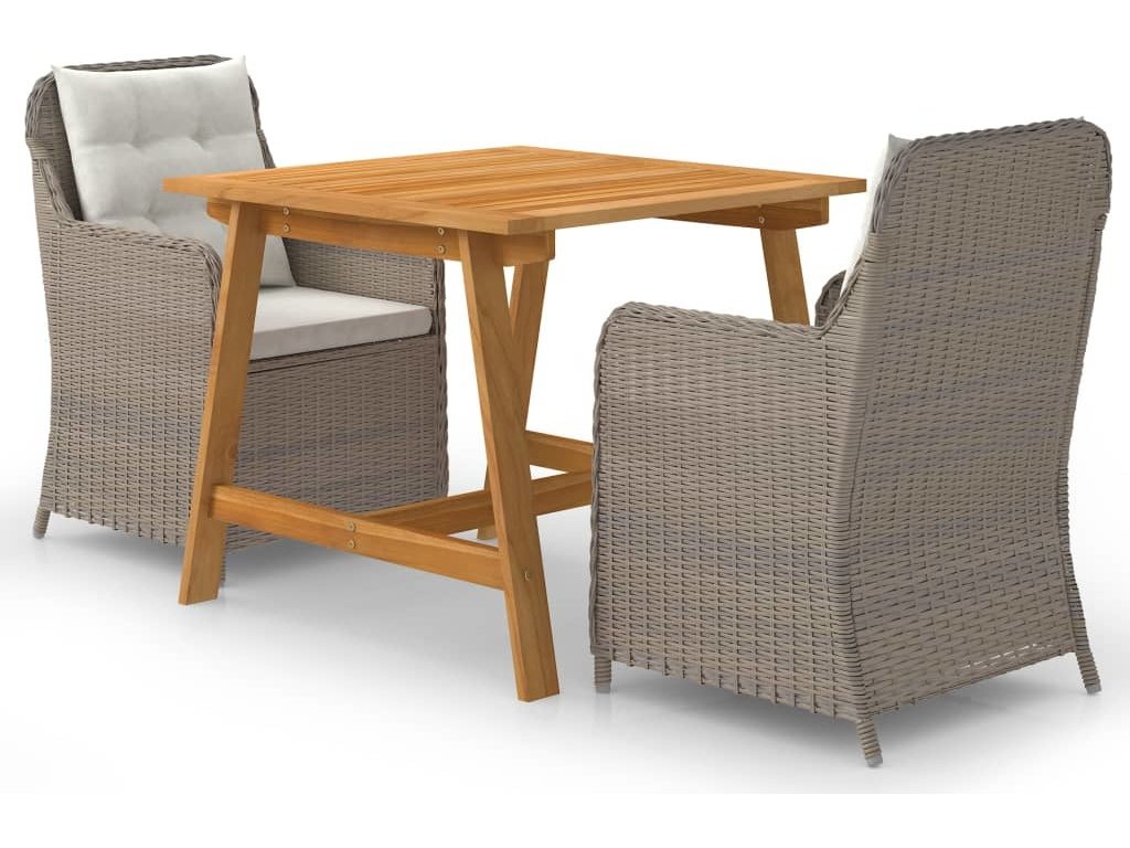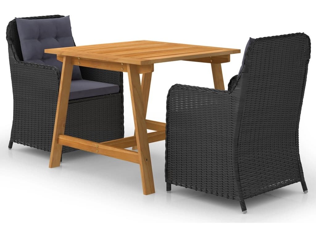 Jídelní stůl je zhotovený z masivního akáciového dřeva s olejovaným povrchem, takže je stabilní, odolný a nenáročný na údržbu. Jídelní židle mají rám z práškově lakované oceli, opletený PE ratanem, který výborně vzdoruje klimatickým vlivům. Dlouho vám proto vydrží a snadno je očistíte. Ergonomický tvar spolu s hustě polstrovanými poduškami vám při sezení zaručí maximální pohodlí. Polyesterové potahy podušek nevyžadují téměř žádnou údržbu a dají se jednoduše stáhnout a oprat.