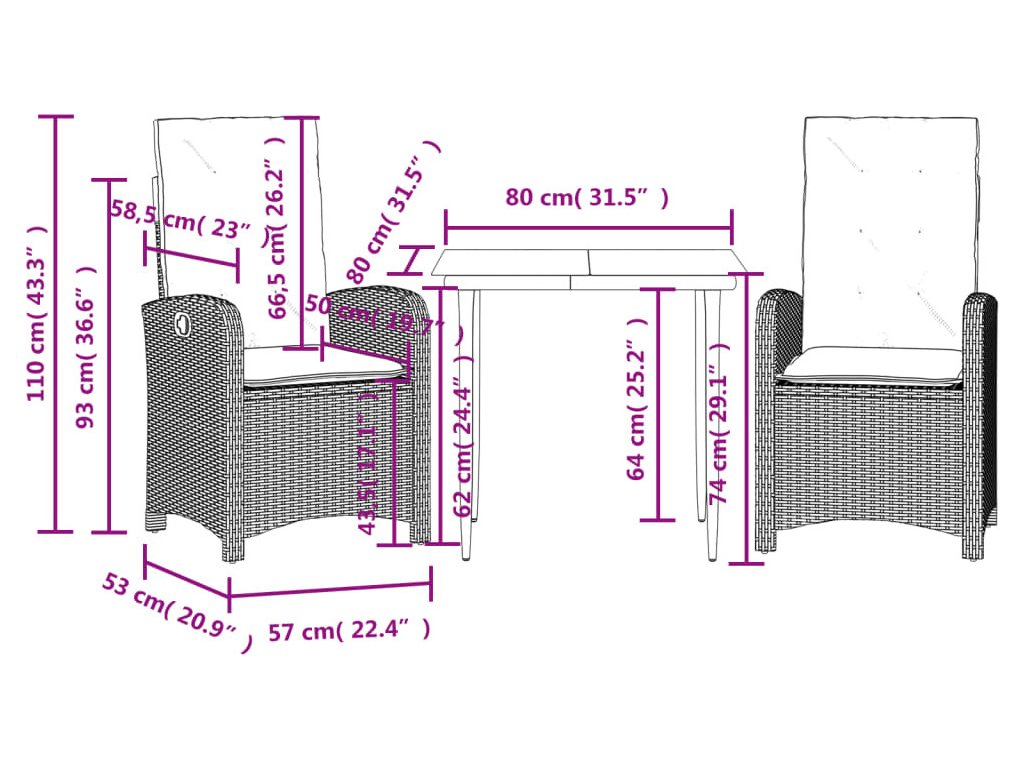 - Rozměry při poloze vsedě: 57 x 58,5 x 93 cm (Š x H x V)