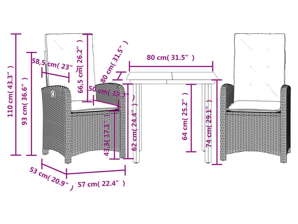- Rozměry při poloze vsedě: 57 x 58,5 x 93 cm (Š x H x V)