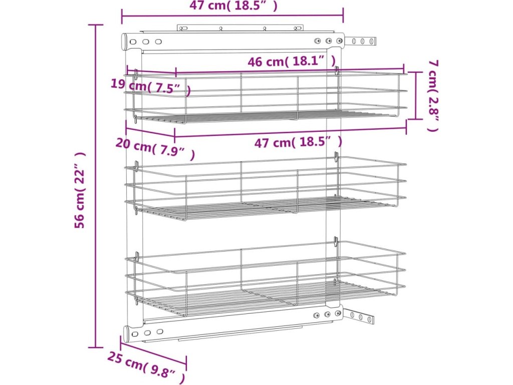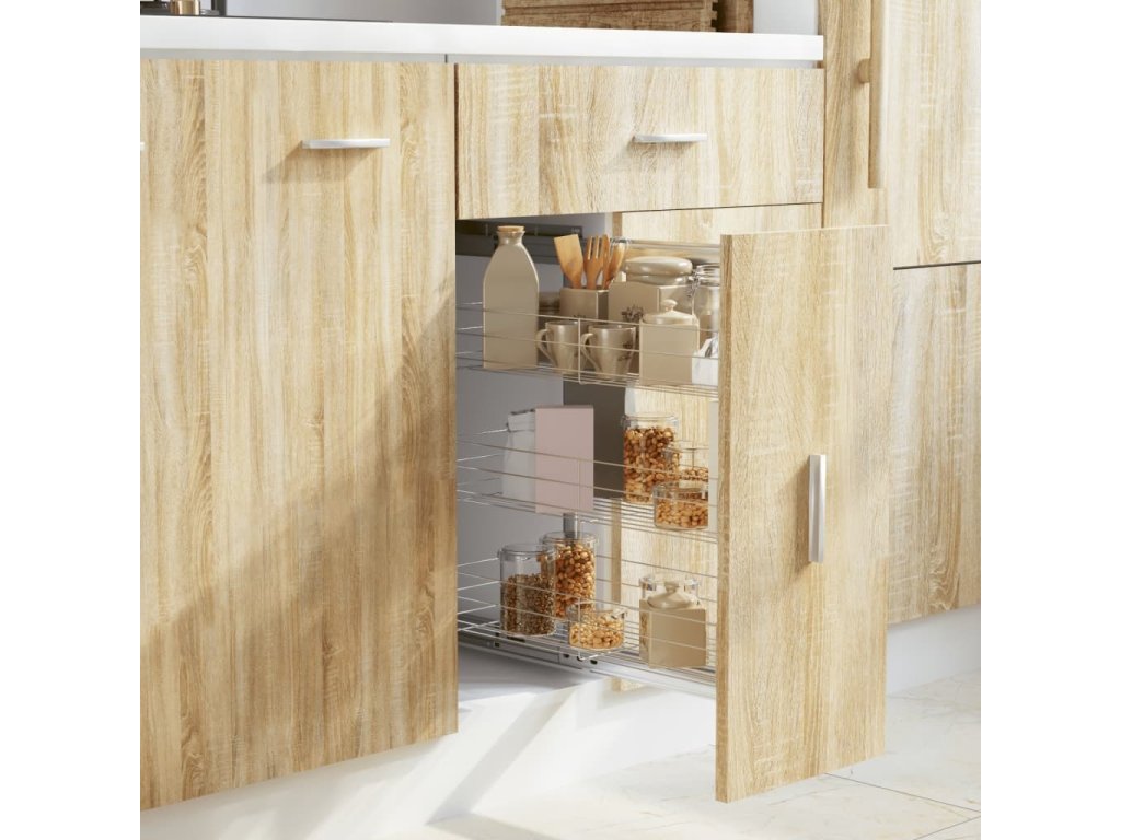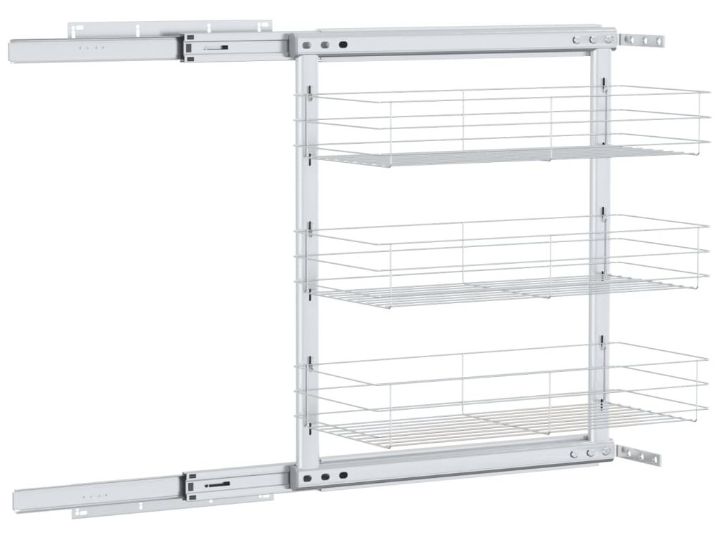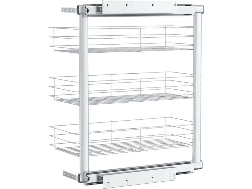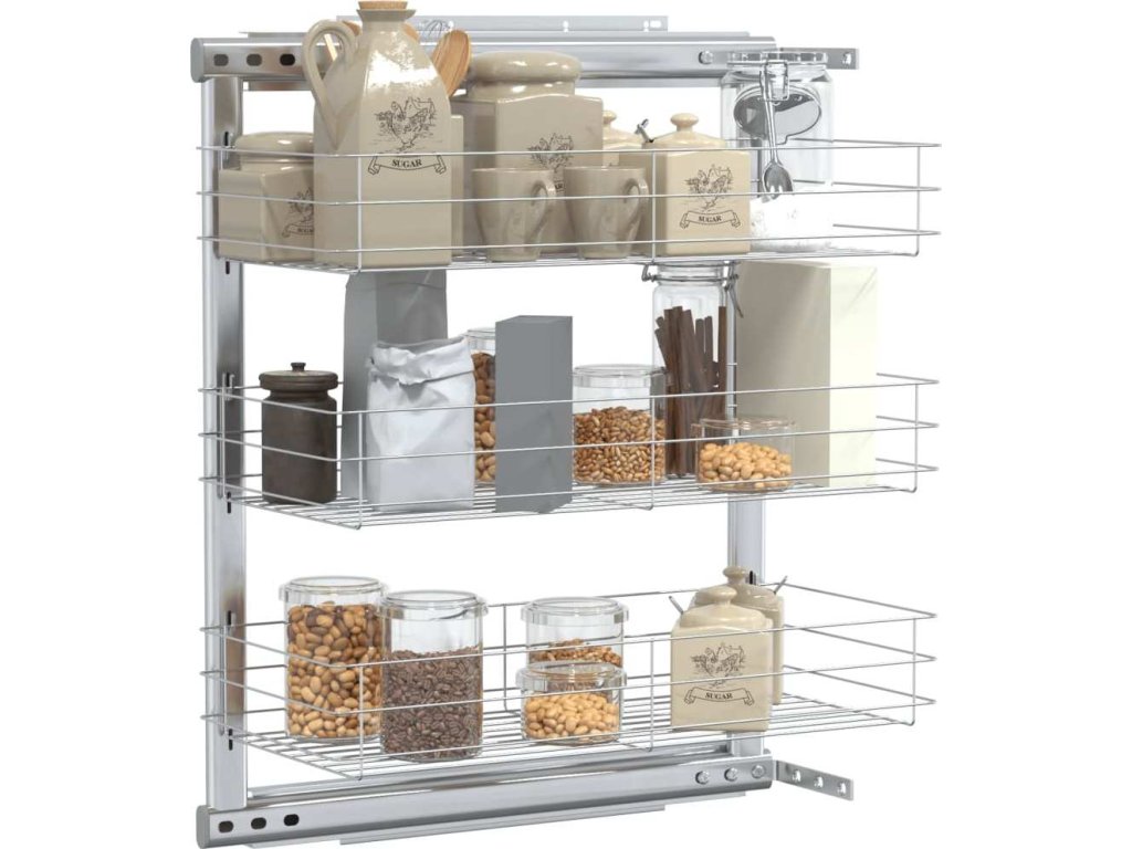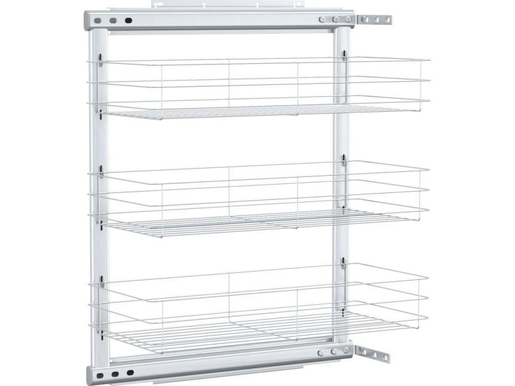 Náš výsuvný drátěný koš bez námahy nainstalujete do své stávající kuchyňské skříňky za pomoci přiloženého montážního příslušenství. Disponuje 3 poličkami, a představuje proto jednoduché a praktické řešení, jak ve skříni optimalizovat úložný prostor.