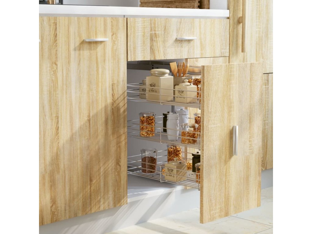 Náš výsuvný drátěný koš bez námahy nainstalujete do své stávající kuchyňské skříňky za pomoci přiloženého montážního příslušenství. Disponuje 3 poličkami, a představuje proto jednoduché a praktické řešení, jak ve skříni optimalizovat úložný prostor.