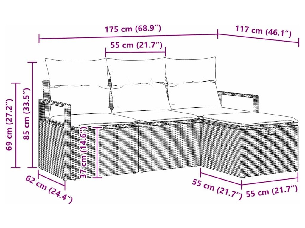 - Integrované úložné prostory: Set má skryté úložné přihrádky, ideální na polštáře nebo jiné osobní věci. Tyto úložné prostory zvyšují praktičnost a udržují váš venkovní prostor uklizený a organizovaný.