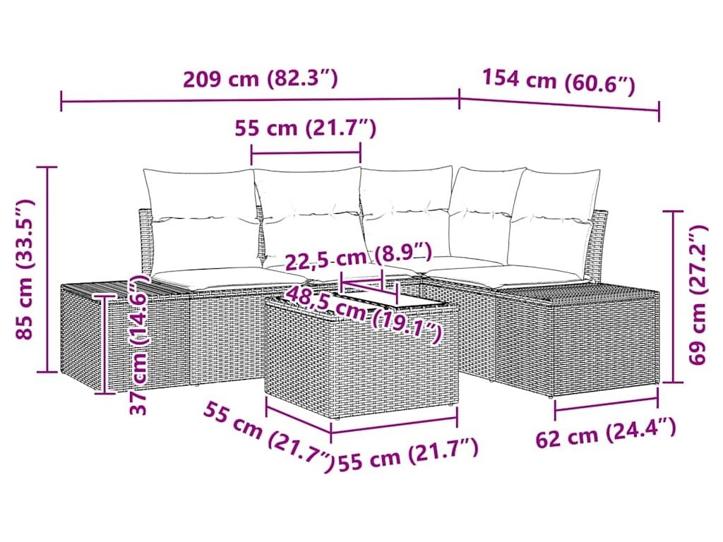 | 1 x Rohové sedadlo: | 62×62×85 cm (Š×H×V) |