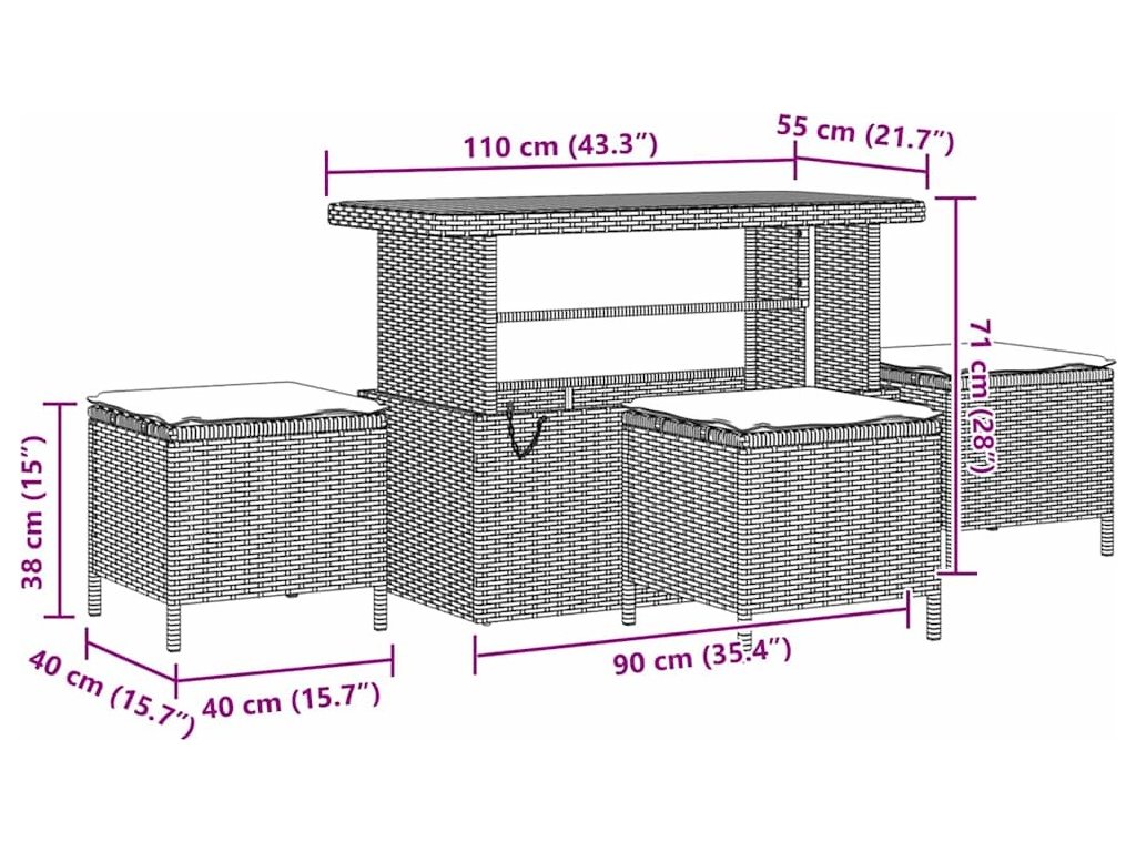 - Nastavitelné prvky Tento zahradní set má nastavitelný komponenty, které vyhoví různým potřebám a požadavkům na prostor. Můžete ho snadno přizpůsobit, a hodí se ideálně do různých venkovních uspořádání.