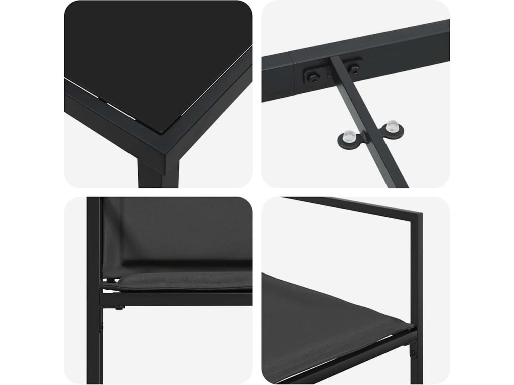 - Materiály: Sada je vyrobená z textilního materiálu, který rychle schne a je dost odolný, takže se pohodlně používá a vydrží. Tvrzené sklo na stole dodává povrchu atraktivní vzhled a zajišťuje bezpečnost. Práškově lakované ocelové rámy jsou robustní a vydrží venkovní povětrnostní podmínky, což zajišťuje stabilní oporu během jakéhokoli setkání.