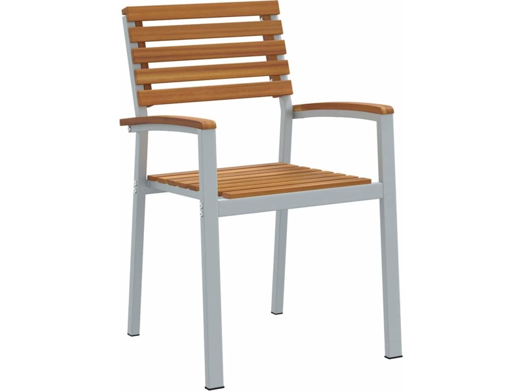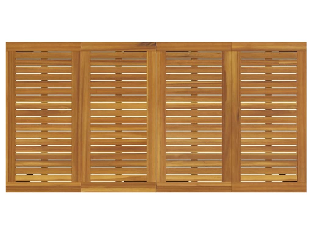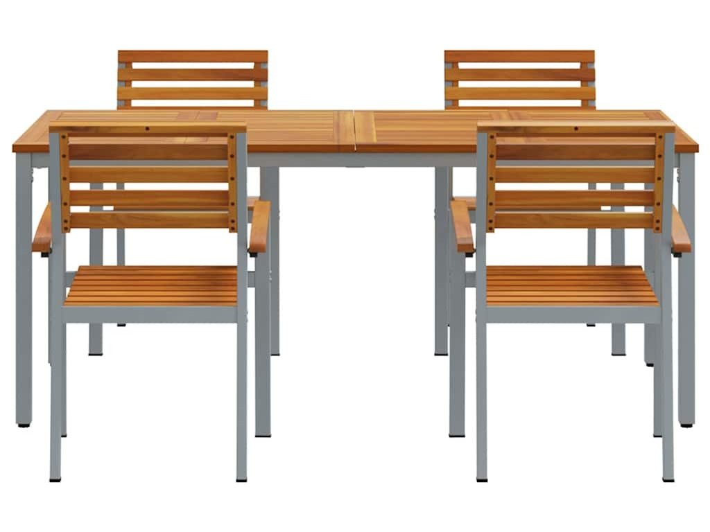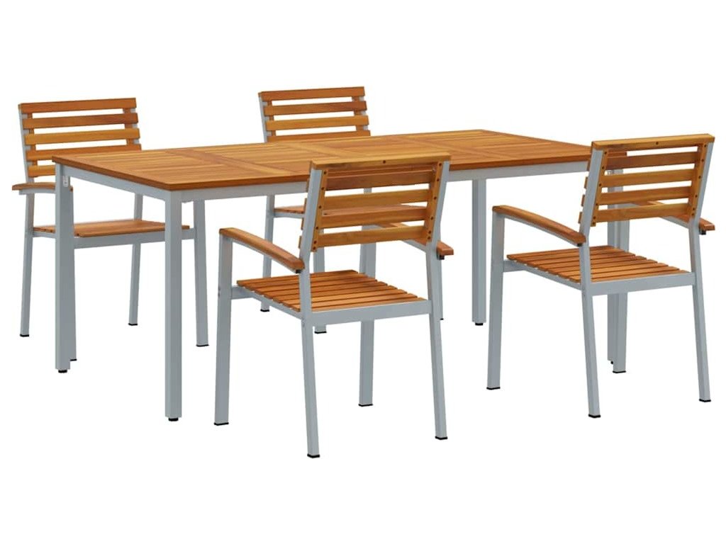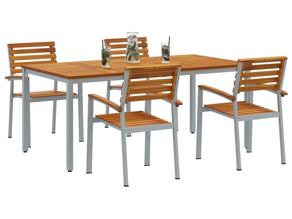 - Materiály: Tento zahradní jídelní set spojuje masivní akáciové dřevo s ocelí, což dává skvělou rovnováhu pro eleganci a stabilitu. Akácie je super odolná a má hezkou strukturu, skvěle doplňuje exteriér. Ocelová konstrukce je pevná a zajišťuje dlouhvěkost.