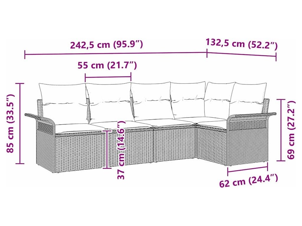 - Celkové rozměry: 242,5 x 132,5 x 85 cm (D x Š x V)