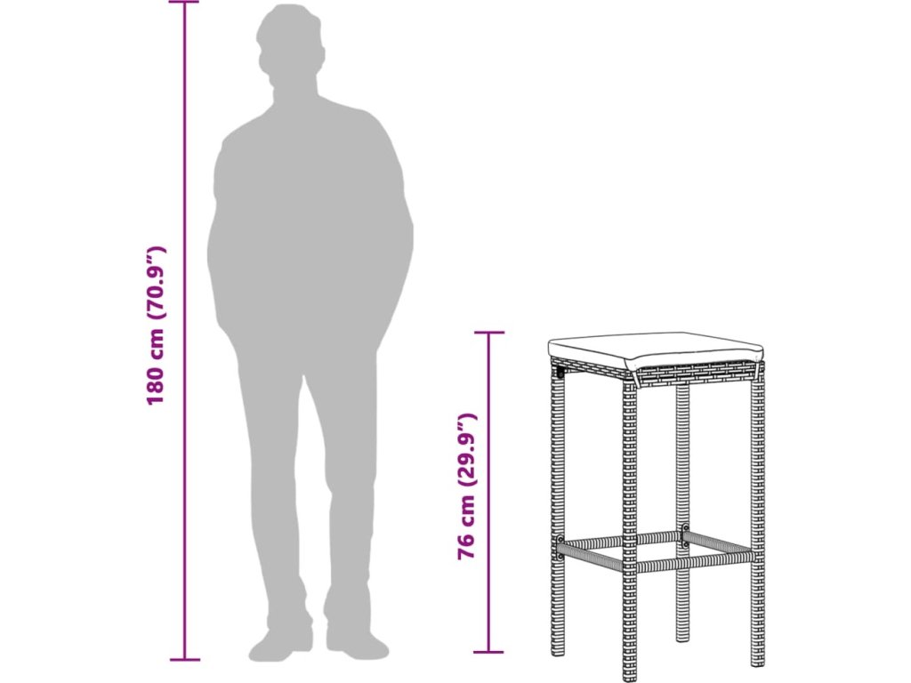 - Odolný materiál: PE ratan neboli polyratan je pevný syntetický materiál s nízkými nároky na údržbu, který vypadá jako přírodní ratan. Je lehký, snadno se čistí a běžně se používá pro venkovní nábytek díky své dlouhé životnosti a odolnosti vůči povětrnostním vlivům. Tyto barové stoličky jsou vyrobeny z lehkého PE ratanu, jsou stabilní a snadno se přemisťují.