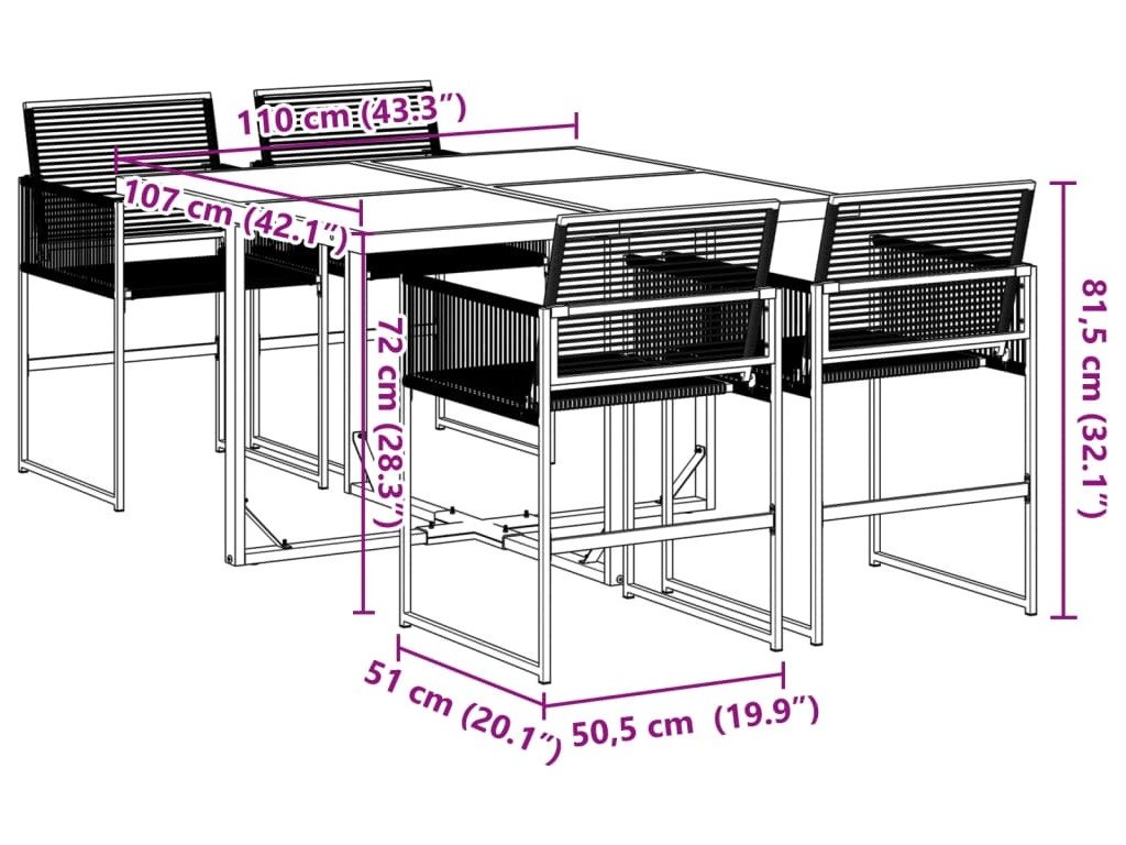 - Kompaktní skladování: Tyto zahradní židle lze úhledně schovat pod stůl a ušetřit tak místo.