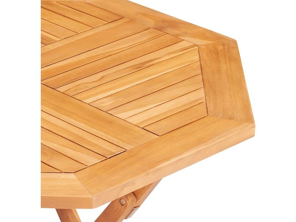 - Masivní teakové dřevo: Jídelní set je vyroben z masivního teaku. Masivní teakové dřevo je krásný přírodní materiál. Prošlo již procesem smršťování, bylo uměle vysušené a poté jemně a dohladka obroušené. Teakové dřevo je známé svou výjimečnou pevností a odolností vůči povětrnostním vlivům.