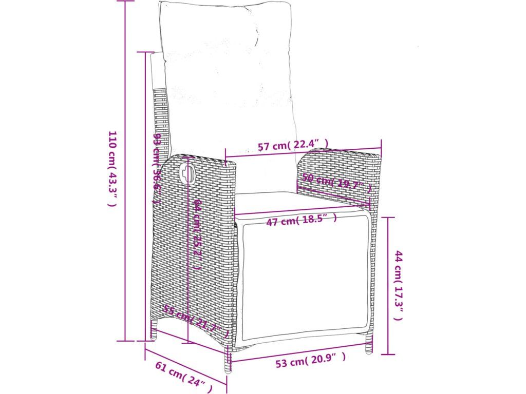 - Rozměry při poloze vsedě: 57 x 61 x 93 cm (Š x H x V)