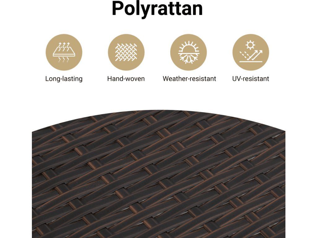 - Odolný materiál: PE ratan neboli polyratan je pevný syntetický materiál s nízkými nároky na údržbu, který vypadá jako přírodní ratan. Je lehký, snadno se čistí a běžně se používá pro venkovní nábytek díky své dlouhé životnosti a odolnosti vůči povětrnostním vlivům.