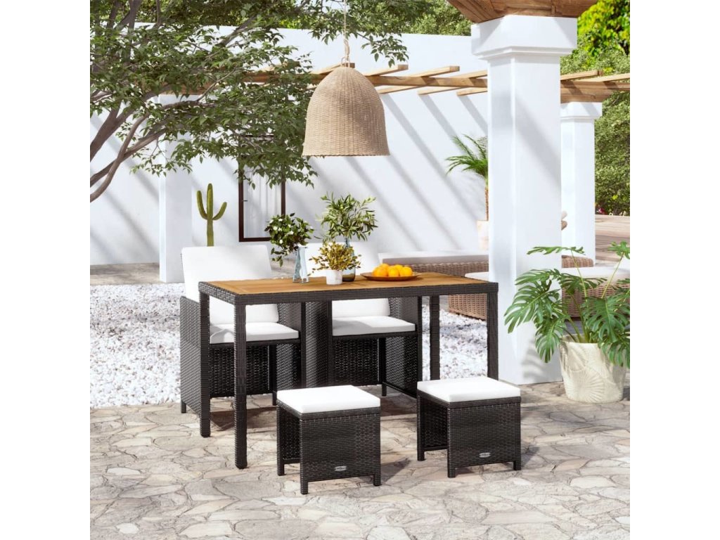 Tento ratanový jídelní set v elegantním designu bude skvělou volbou pro stolování na čerstvém vzduchu nebo relaxaci na zahradě. Ocelové rámy s práškovým nástřikem dodávají stolu, židlím i stoličkám pevnost a robustnost a díky lehké konstrukci se dají všechny kusy snadno přesouvat. Protože je vyroben z PE ratanu, odolného vůči vodě a povětrnostním vlivům, dá se jídelní set snadno čistit. Stolní deska z tvrdého akáciového dřeva s přírodním olejovým nátěrem se dá snadno čistit otřením vlhkým hadříkem.