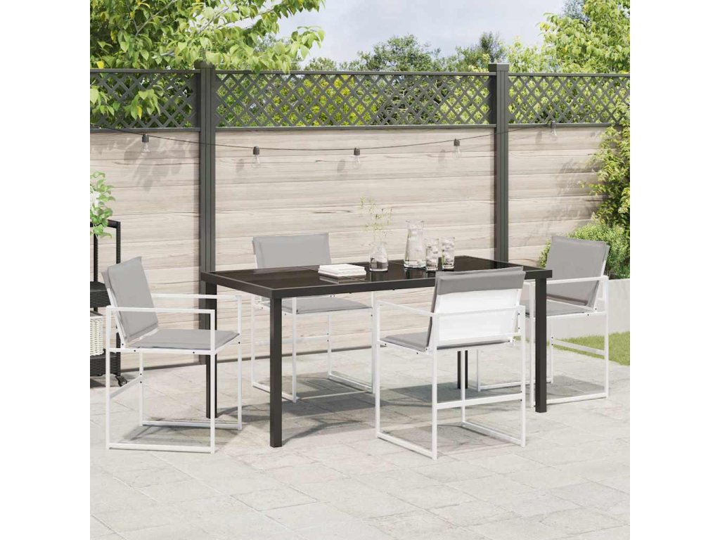 - Materiály: Sada je vyrobená z textilního materiálu, který rychle schne a je dost odolný, takže se pohodlně používá a vydrží. Tvrzené sklo na stole dodává povrchu atraktivní vzhled a zajišťuje bezpečnost. Práškově lakované ocelové rámy jsou robustní a vydrží venkovní povětrnostní podmínky, což zajišťuje stabilní oporu během jakéhokoli setkání.