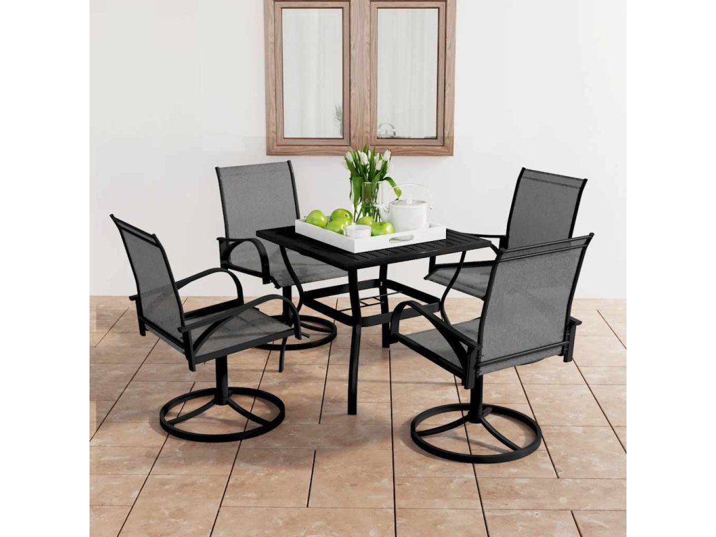 Tento zahradní stůl a jídelní židle jsou vyrobeny z práškově lakované oceli, tudíž jsou robustní a stabilní. Sedadla a opěradla židlí z prodyšné textilní tkaniny dobře větrají a rychle schnou. 360° otočná kulatá základna, ergonomická podpora zad a zaoblené područky vám poskytnou lepší uživatelský komfort a pohodlí při posezení na zahradě.