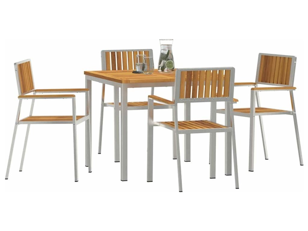 Tato moderní venkovní jídelní souprava je pro ty, co ocení kombinaci stylu a praktičnosti. S důrazem na jednoduchost, perfektně zapadne do každé zahrady nebo terasy a nabídne stylové místo pro poklidné jídla a setkání. Moderní akcent nerezové oceli dodává minimalistický vzhled, který doplňuje přírodní pozadí. Čisté linie a hladké povrchy posilují elegantní atmosféru, což z ní dělá ideální místo na jídlo venku nebo na relaxaci.]},{