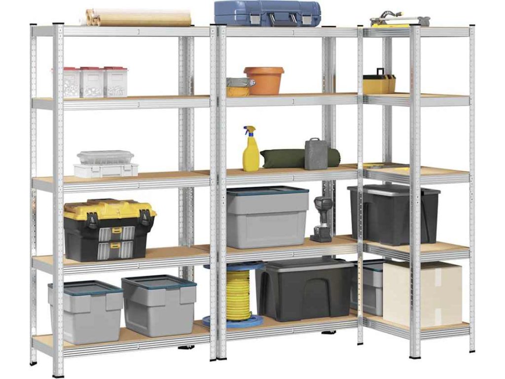 - Pevný materiál: Úložný regál se skládá z ocelových rámů a dřevěných desek. Ocelové rámy zaručují robustnost a stabilitu, zatímco kompozitní dřevo nabízí pevnost, stabilitu a odolnost proti vlhkosti.