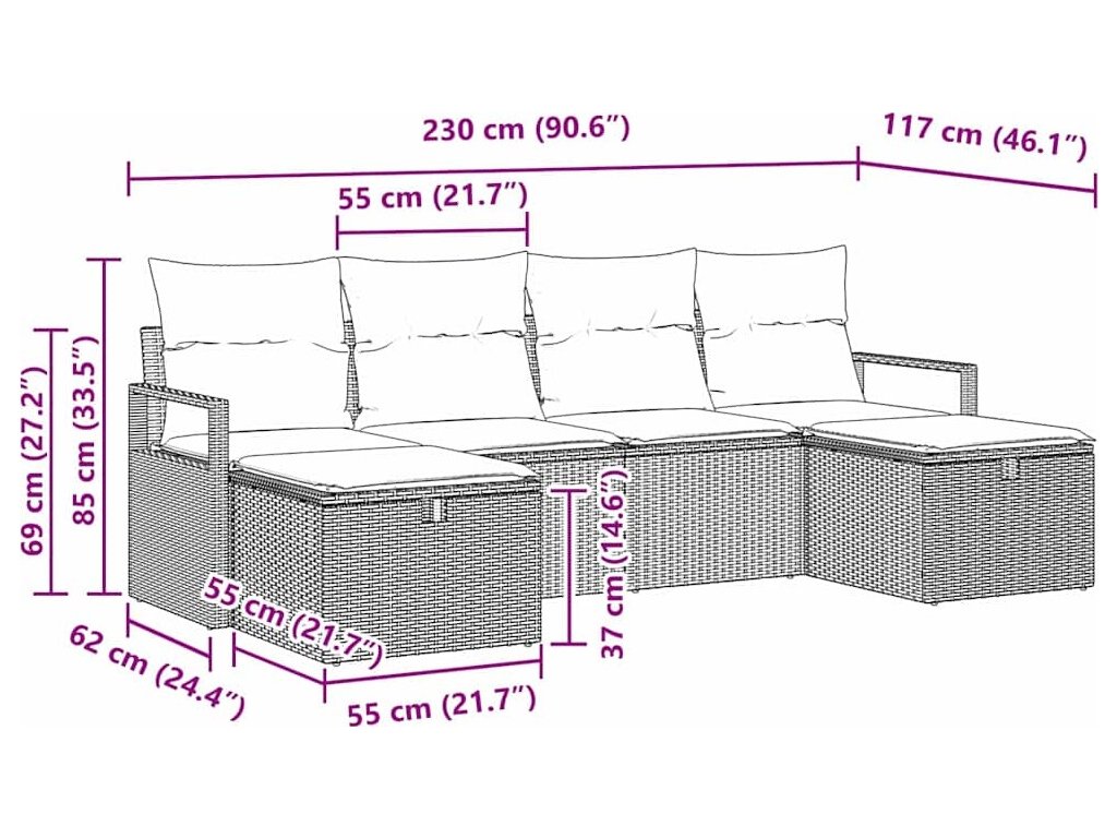 - Součásti: Sestava má dvě centrální sedačky, dvě arm-sofy a dvě podnožky, které si můžete rozmístit podle potřeby. Podnožky jsou skvělé pro sezení nebo relaxaci.