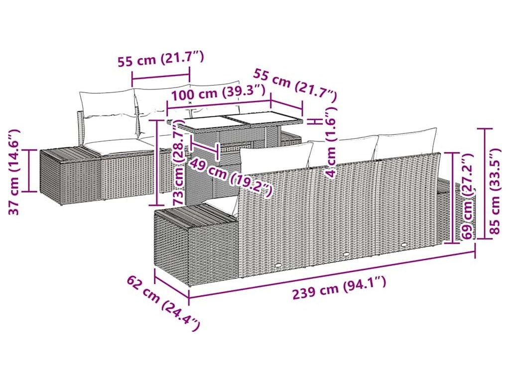 - 4 x boční pohovka: 184 x 62 x 85 cm (D x Š x V)
