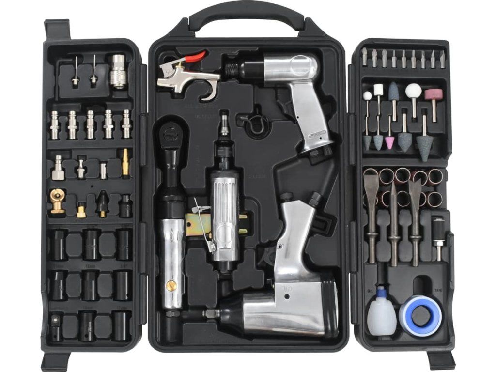 Tato kompletní sada obsahuje výběr z oblíbených vzduchových nástrojů (1/2" pneumatický rázový klíč, 1/4" pneumatická mini bruska, 3/8" ráčnový klíč, pneumatické kladivo 150 mm a foukací pistole) a další příslušenství (např. hadicové nástavce a spojky, kladivová dláta, brusné kameny, rázové hlavice apod.) pro profesionální řízení, broušení, sekání atd. Tato pneumatická sada nástrojů je nutností pro každou dílnu, garáž a kůlnu.