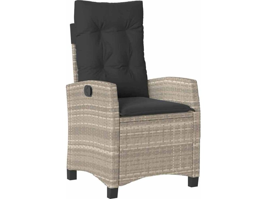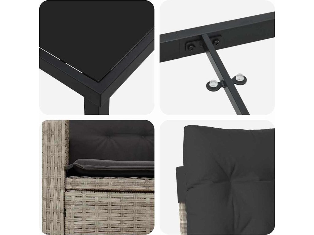 - Materiály: Set je vyrobený z poly ratanu a odolné oceli, zajišťující trvanlivost a eleganci. Poly ratan se přirozeně brání UV záření a špatnému počasí, takže je ideální na slunečné dny, a ocelový rám dodává pevnost a stabilitu pro dlouhodobé používání.