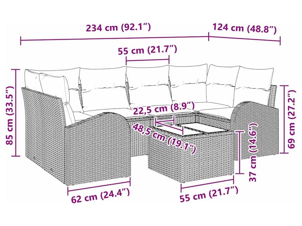 - Součásti: Sada obsahuje: dvě rohové sedačky, dvě středové sedačky, dvě pohovky s opěrkami a jeden stůl, všechny s tvrzeným sklem. Konstrukce má ocelové rámy, které zajišťují stabilitu a sílu, zatímco poly ratanové opěradla a loketní opěrky dávají dobrou podporu pro dlouhé sezení.