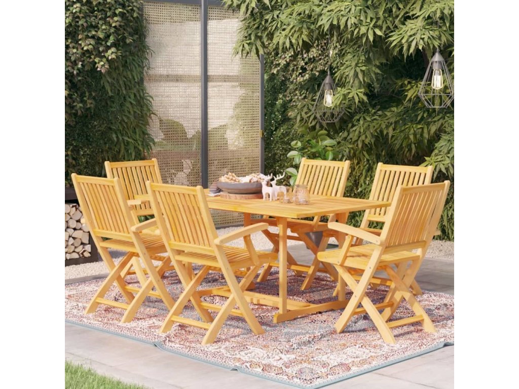 Nábytková sestava má překrásnou povrchovou úpravu, která dřevu dodává hřejivý odstín. Ve stolu se nachází otvor na slunečník, abyste se mohli chránit před sluncem. Zaoblené sedáky a opěradla židlí ideálně kopírují tvar vašeho těla. Židle mají navíc skládací design, aby vám zbytečně nepřekážely, když je zrovna nepoužíváte. Lehká konstrukce usnadňuje jejich přesouvání. Celá sada nábytku vám poskytne maximální pohodlí a zpříjemní vám čas strávený s vaší rodinou a přáteli. K očištění vám přitom postačí navlhčený hadřík.