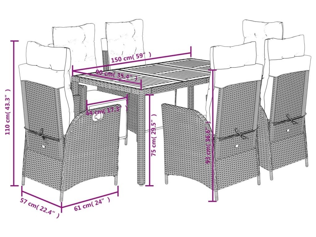 - Materiál: PE ratan, práškově lakovaná ocel, masivní akáciové dřevo s olejovou povrchovou úpravou