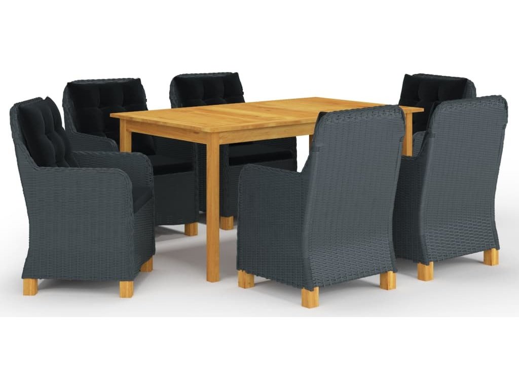 Jídelní stůl je zhotovený z masivního akáciového dřeva s olejovaným povrchem, takže je stabilní, odolný a nenáročný na údržbu. Zahradní židle mají rám z práškově lakované oceli, opletený kulatým PE ratanem, který výborně vzdoruje klimatickým vlivům. Dlouho vám proto vydrží a snadno je očistíte. Hustě polstrované podušky vám při odpočinku zaručí mimořádný komfort. Jejich potahy jsou opatřené zipem, abyste je mohli bez námahy stáhnout a oprat. Nohy z masivního akáciového dřeva přispívají k lepší stabilitě a delší životnosti. Vzhledem k jejich lehké konstrukci lze jídelní židle jednoduše přesouvat, kam potřebujete.