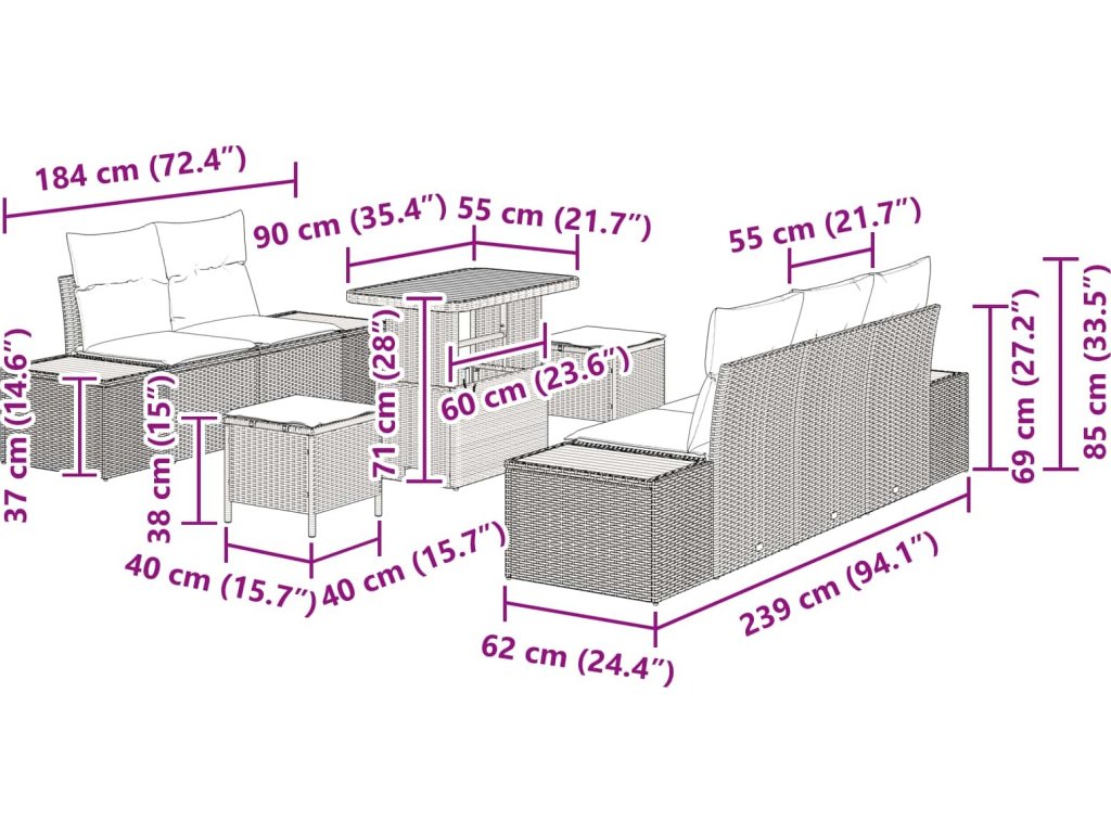 - Součásti: Pohovková souprava má pohodlné polštáře s odnímatelnými polyesterovými potahy pro snadnou údržbu. Ergonomičtě navržené opěrky z poly ratanu skvěle podporují. Modulární design umožňuje kreativitu při uspořádání.