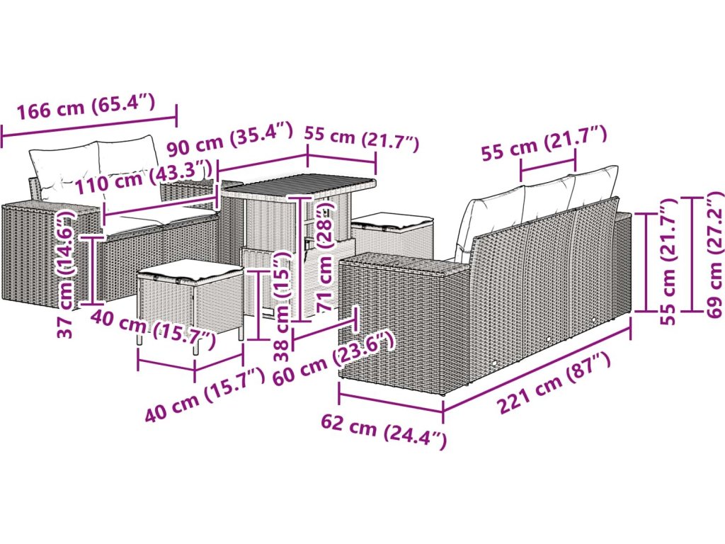 - Zahrnuté komponenty: Každý díl tohoto setu má poly ratanové opěrky a ergonomická opěradla pro maximální pohodlí. Pevné ocelové nohy dodají stabilitu a modulární design umožňuje snadné přizpůsobení. Polštáře z polyesterových vláken zajišťují komfort a odolnost během používání.