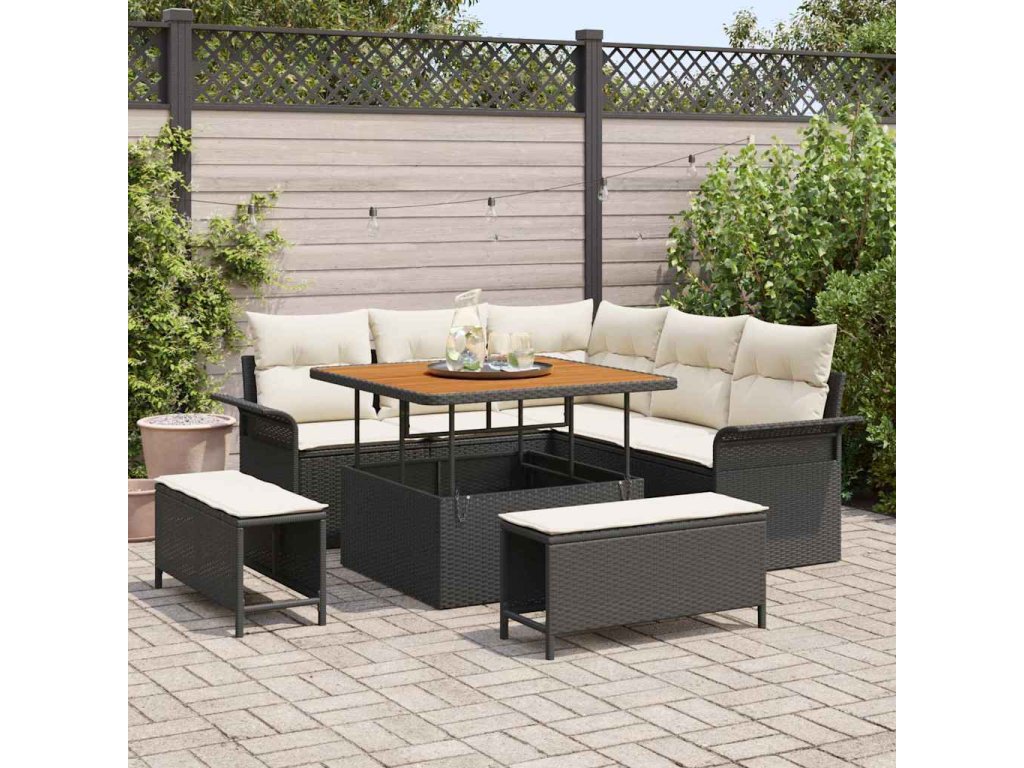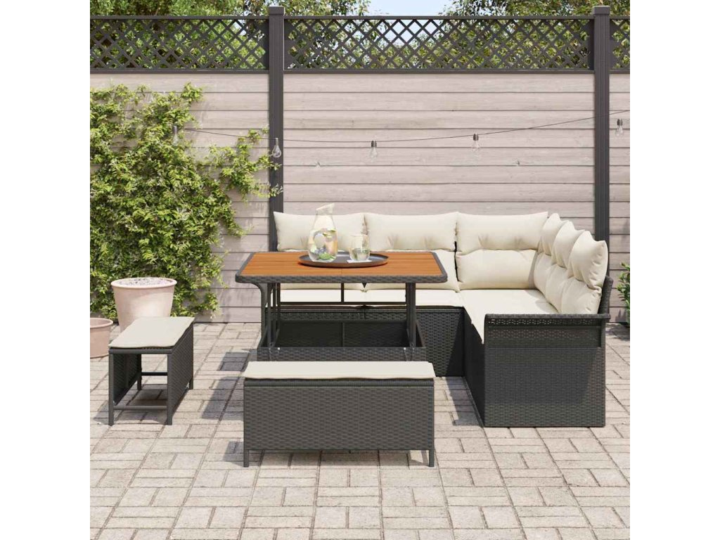 - Špičkové materiály: Sada pohovek je většinou z poly ratanu, odolného vůči počasí. Je perfektní pro venkovní použití, protože snižuje opotřebení během sezóny. Odolná a s rámem z práškově lakované oceli, což ji dělá pevnou proti různým povětrnostním podmínkám. Akáciové dřevo skvěle vypadá a zůstává bez prasklin.