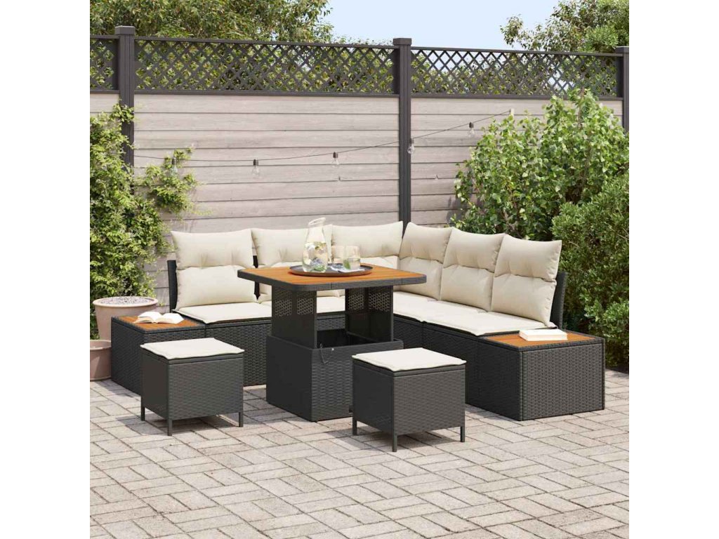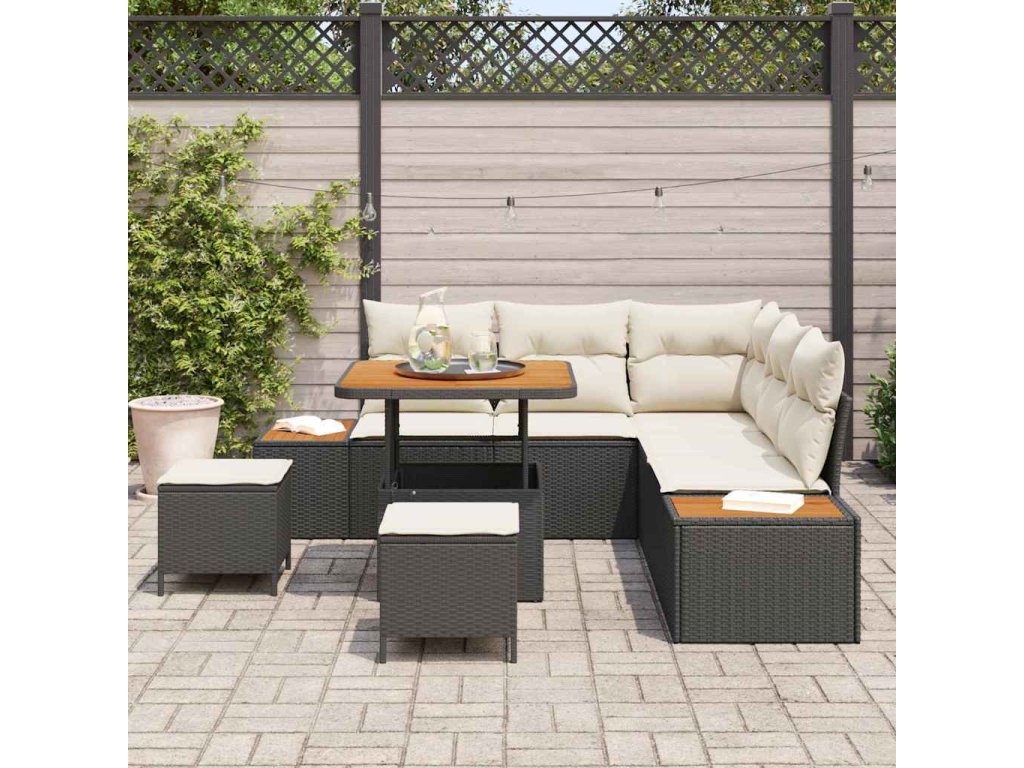 - Kvalitní materiály: Odolný poly ratan zajišťuje dlouhou životnost a UV ochranu, takže ji slunce nepoškodí. Masivní akáciové dřevo přidává přírodní krásu a pevnost a celkově vylepšuje pohodlí vašeho venkovního prostoru. Každý materiál je vybranej pro svou odolnost, takže souprava zůstane atraktivní a funkční po celou sezonu.